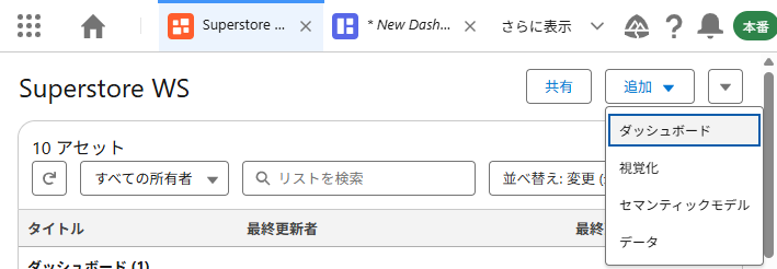 ダッシュボードは、Tableau Next のワークスペースから作成できます。