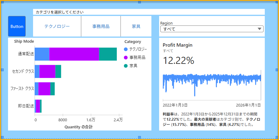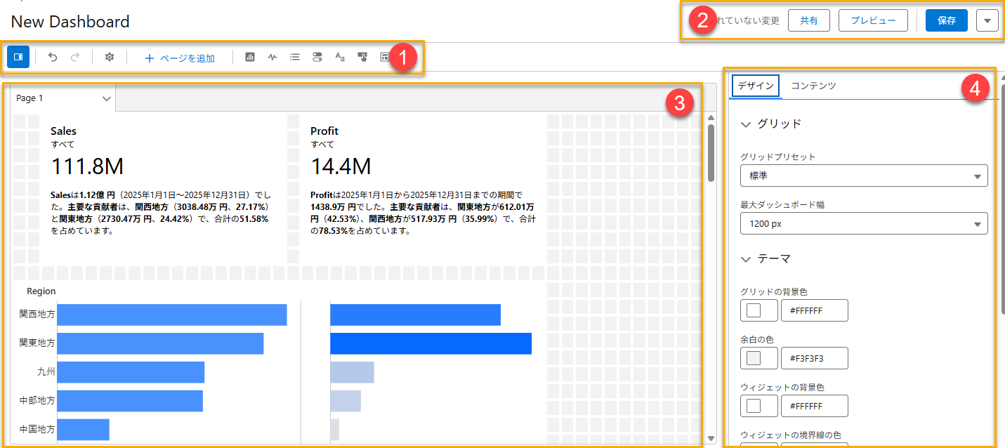 - ダッシュボードのデザインやコンテンツを微調整します。データソースの選択、ビジュアライゼーションの設定、書式の適用、インタラクティブ機能の設定などのコントロールがあります。