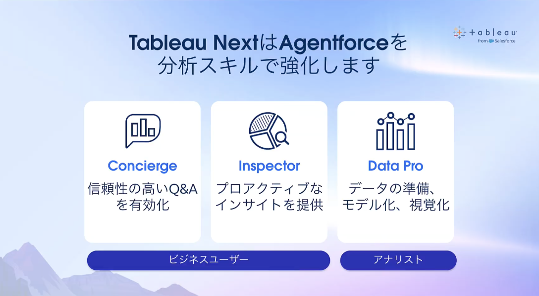 - Tableau NextにおけるAI エージェントの概要(Concierge, Inspector, Data Pro)