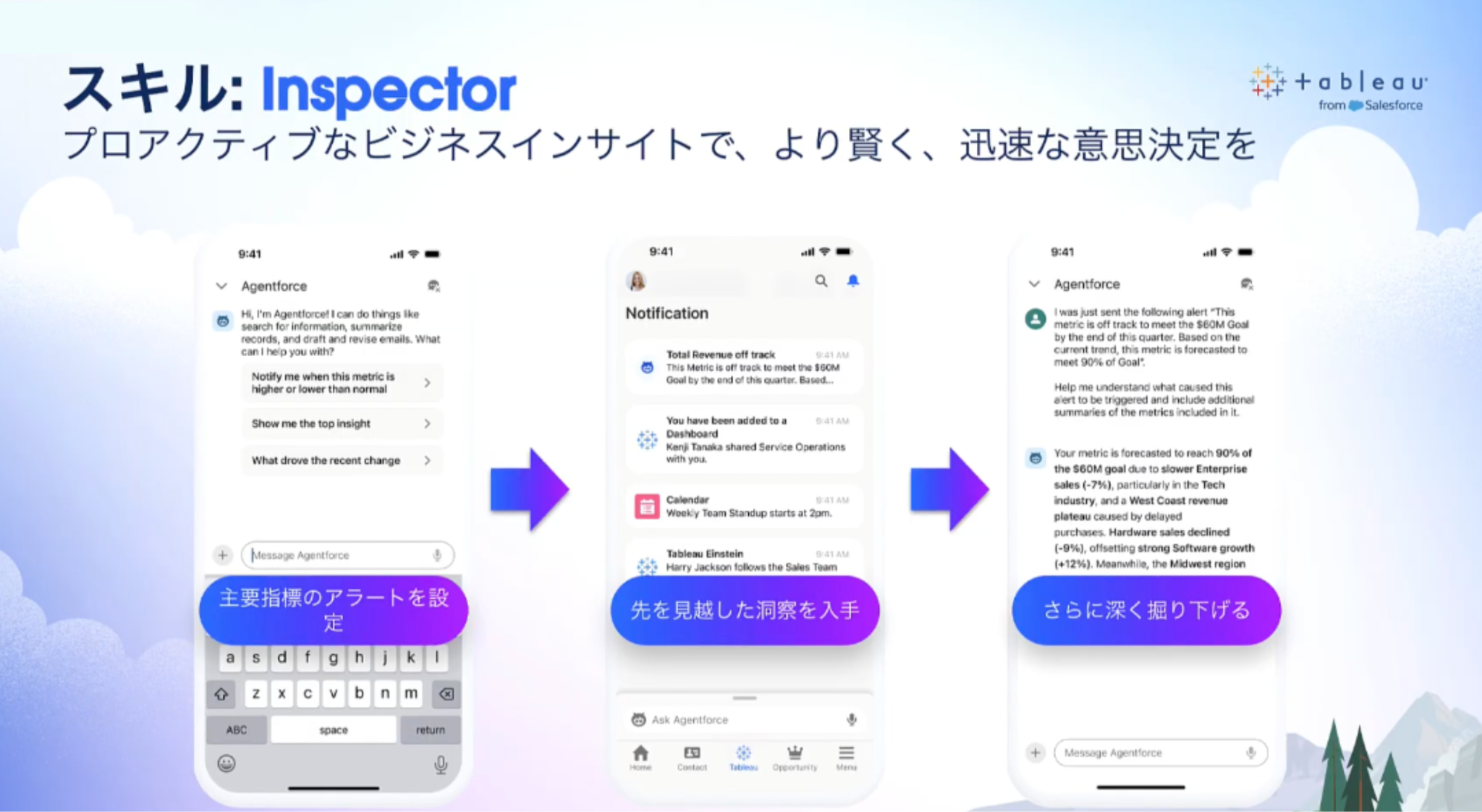 - Inspectorは、データの異常や変化を検知し、プロアクティブ(能動的)にビジネスインサイトを提供する機能です。