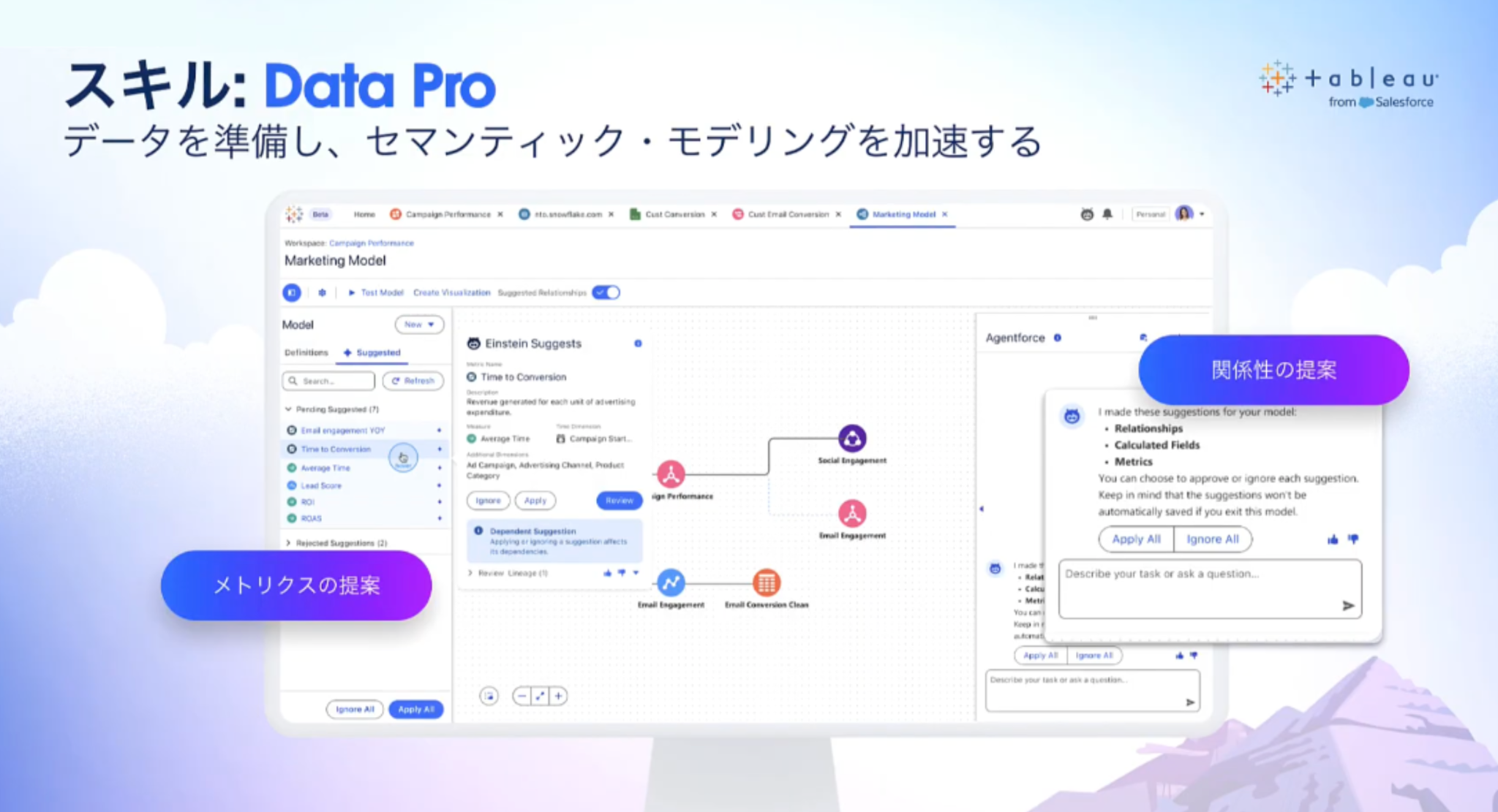 Tableau Next はAgentforce とネイティブに統合されており、AIエージェントがデータの理解やインサイト分析をサポートします。