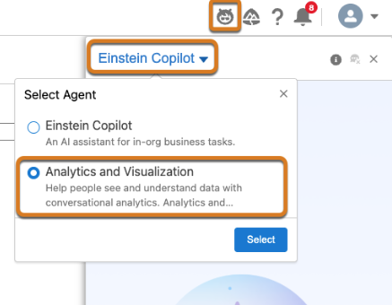 - [AIエージェント名 ▼] をクリックし、Tableau Next初期設定手順でテンプレートから作成したAIエージェント名(デフォルトでは、"Analytics and Visualization") を選択します。