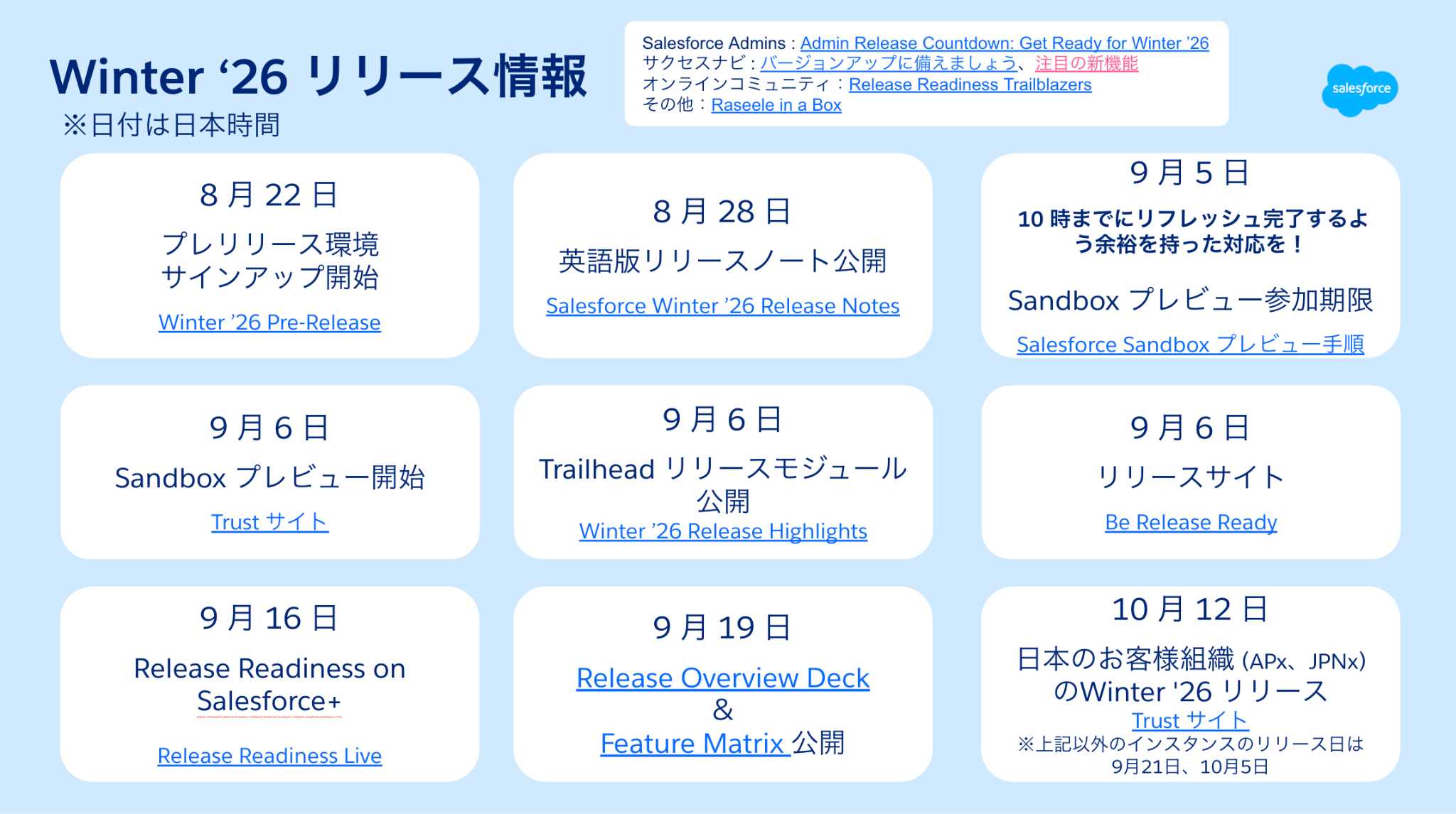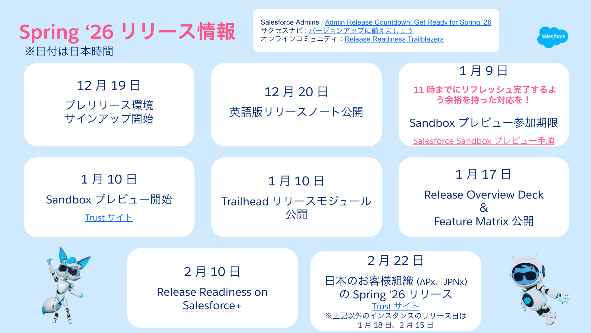 Salesforce Admin ブログで、GetReady for Spring ‘26 の記事が公開され、全体のスケジュールを確認することができるようになっています。