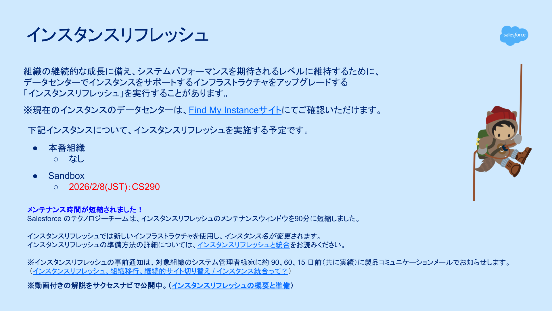 Sandbox 組織で 2026 年 2 月 8 日(日本時間)にインスタンスリフレッシュが計画されています。