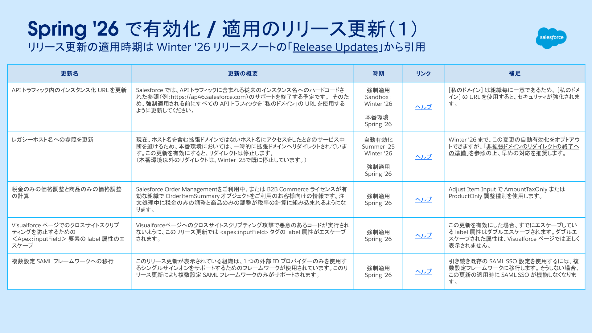 特に更新情報はございませんが、URL リダイレクトの廃止や複数設定 SAML フレームワークへの移行などが控えておりますので、システム管理者のみなさまは、内容をご確認いただき、Spring'26へのご準備をお願い致します。