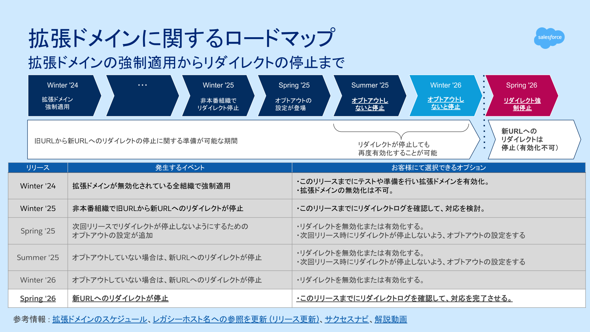 しかしながら、Spring '26 のリリースをもって、このリダイレクトは完全に停止し、リダイレクトを有効化することはできなくなります。