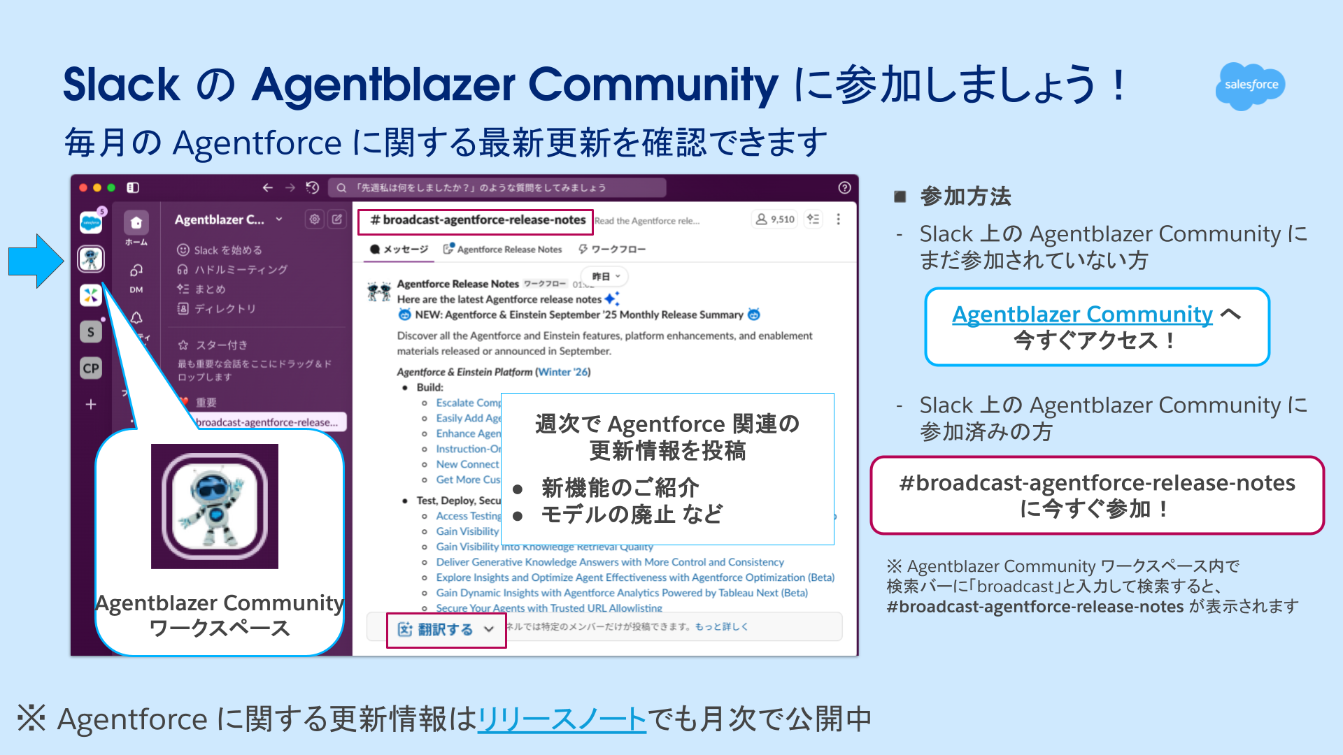 Agentforce の製品に関する毎月の最新情報はリリースノートにて確認頂けますが、Slack の「Agentblazer Community」では、より早く情報をご確認いただけます。