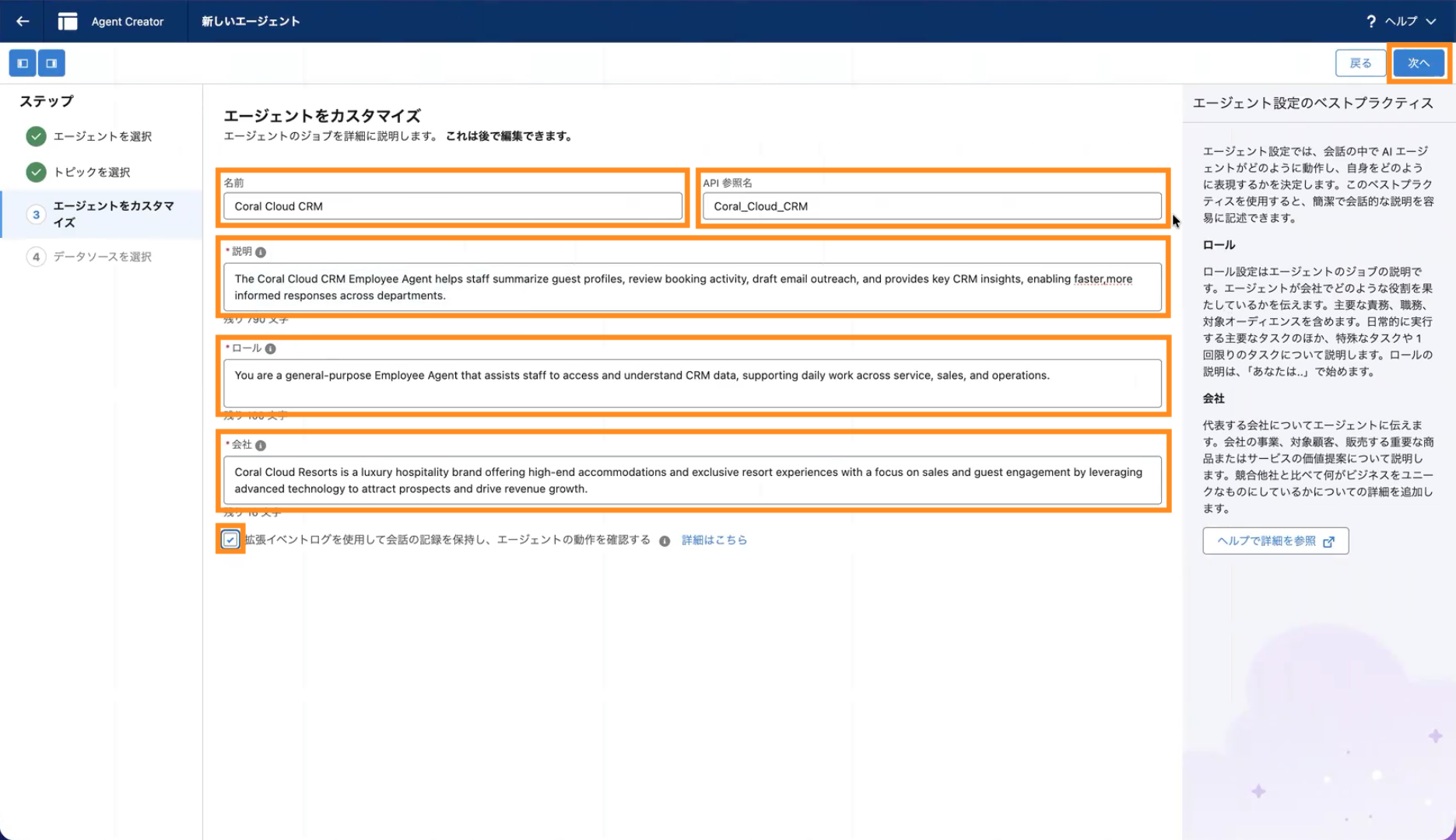 5.エージェントをカスタマイズする画面で、[名前][API名][説明][ロール][会社]で以下を入力します。