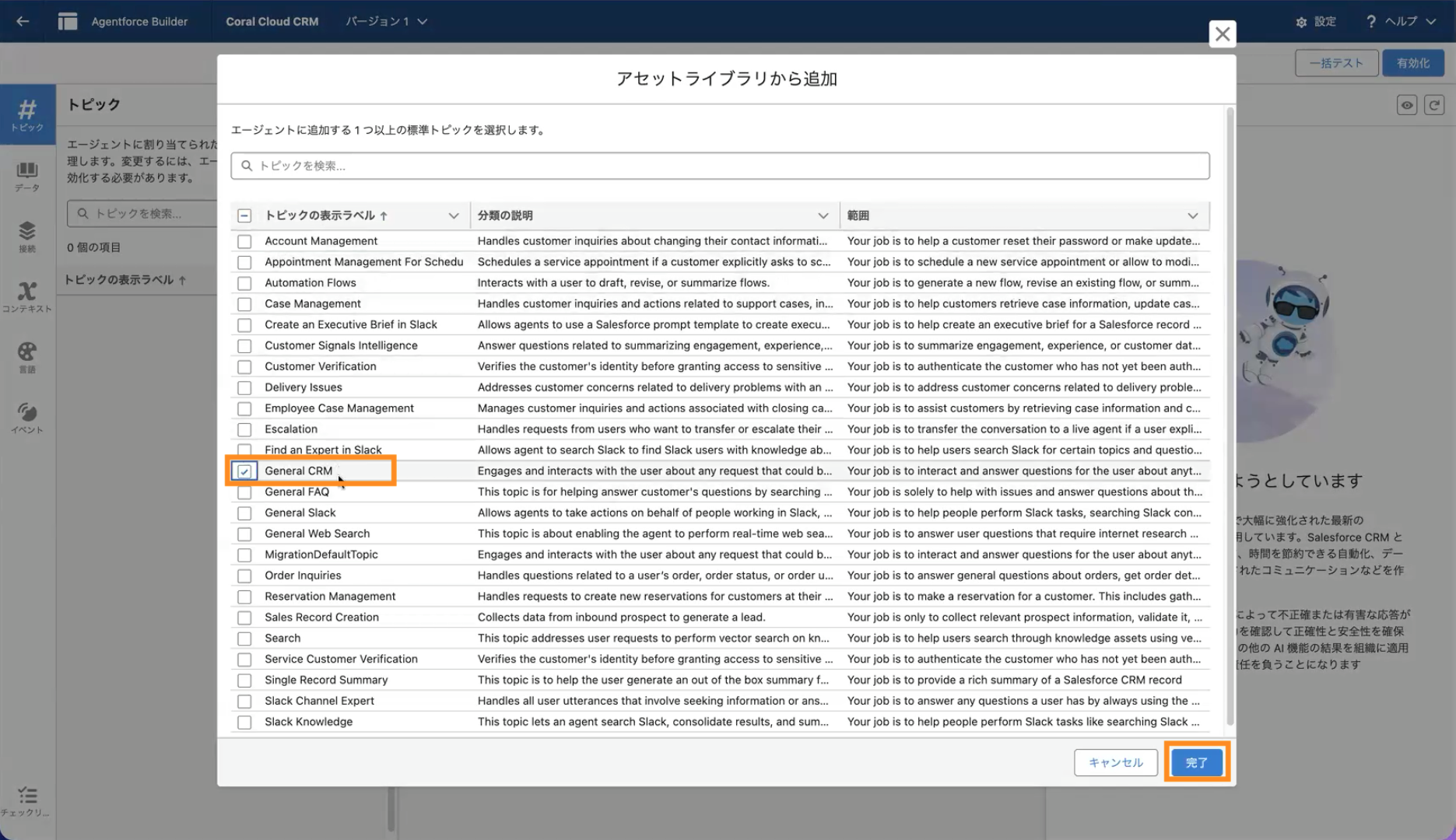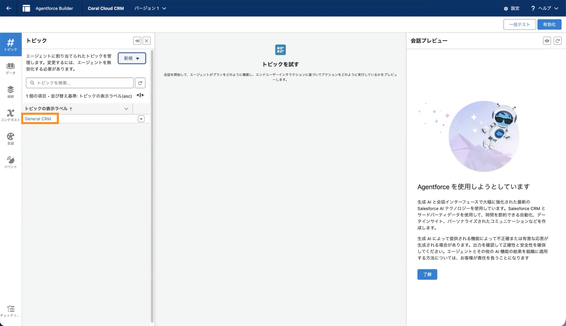 本記事では、Agentforce Employee Agent の作成から、標準トピック「General CRM」を追加し、有効化するまでの手順をご紹介しました。