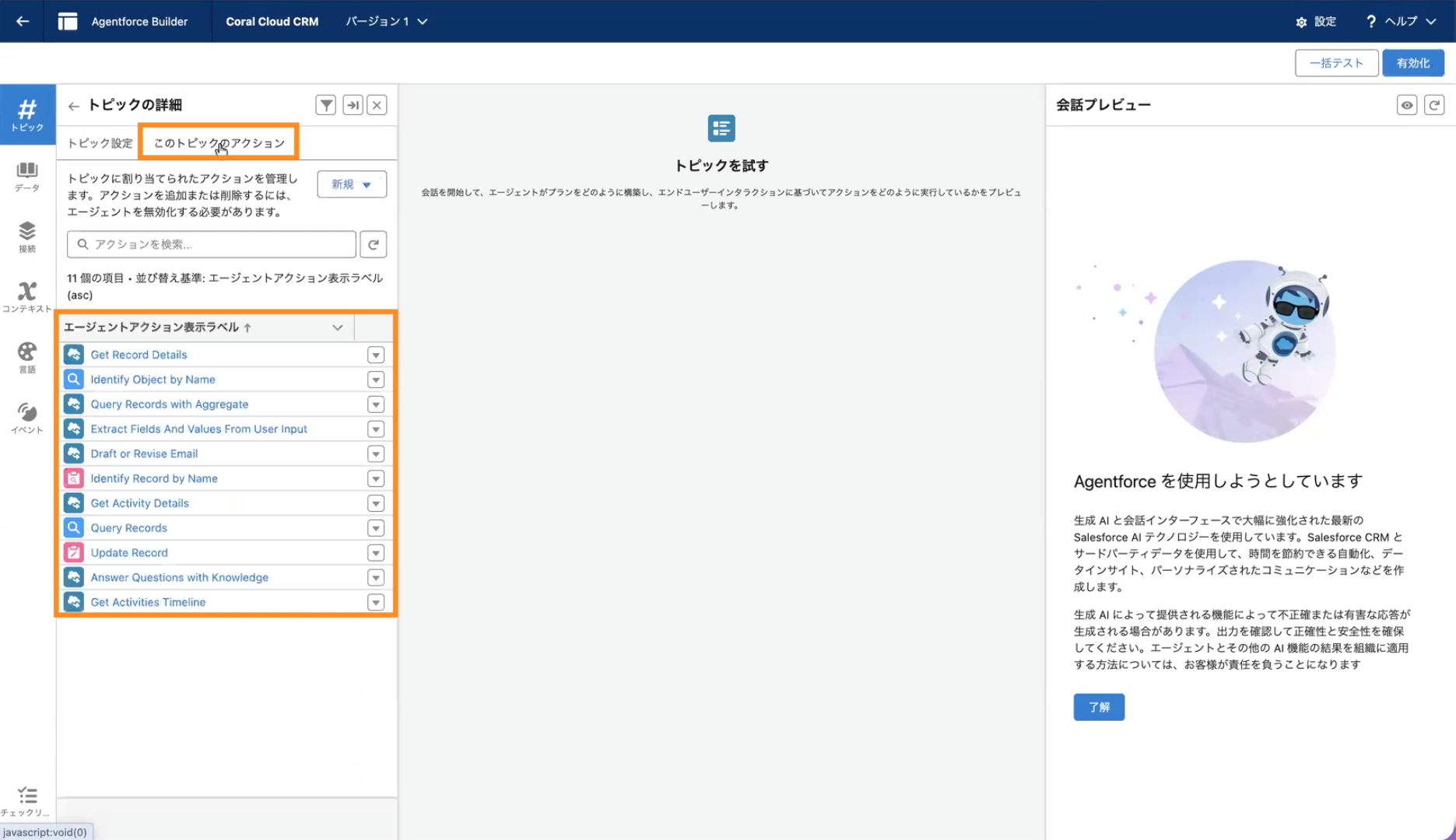 【重要】テスト時の注意点: 一部の標準アクション(Query Records 等)は日本語でのオープンな質問(例:「私の商談を教えて」)を十分にサポートしていません。そのため、まずは具体的なレコード名を指定して特定し、その後詳細を聞く手順でテストを行います。