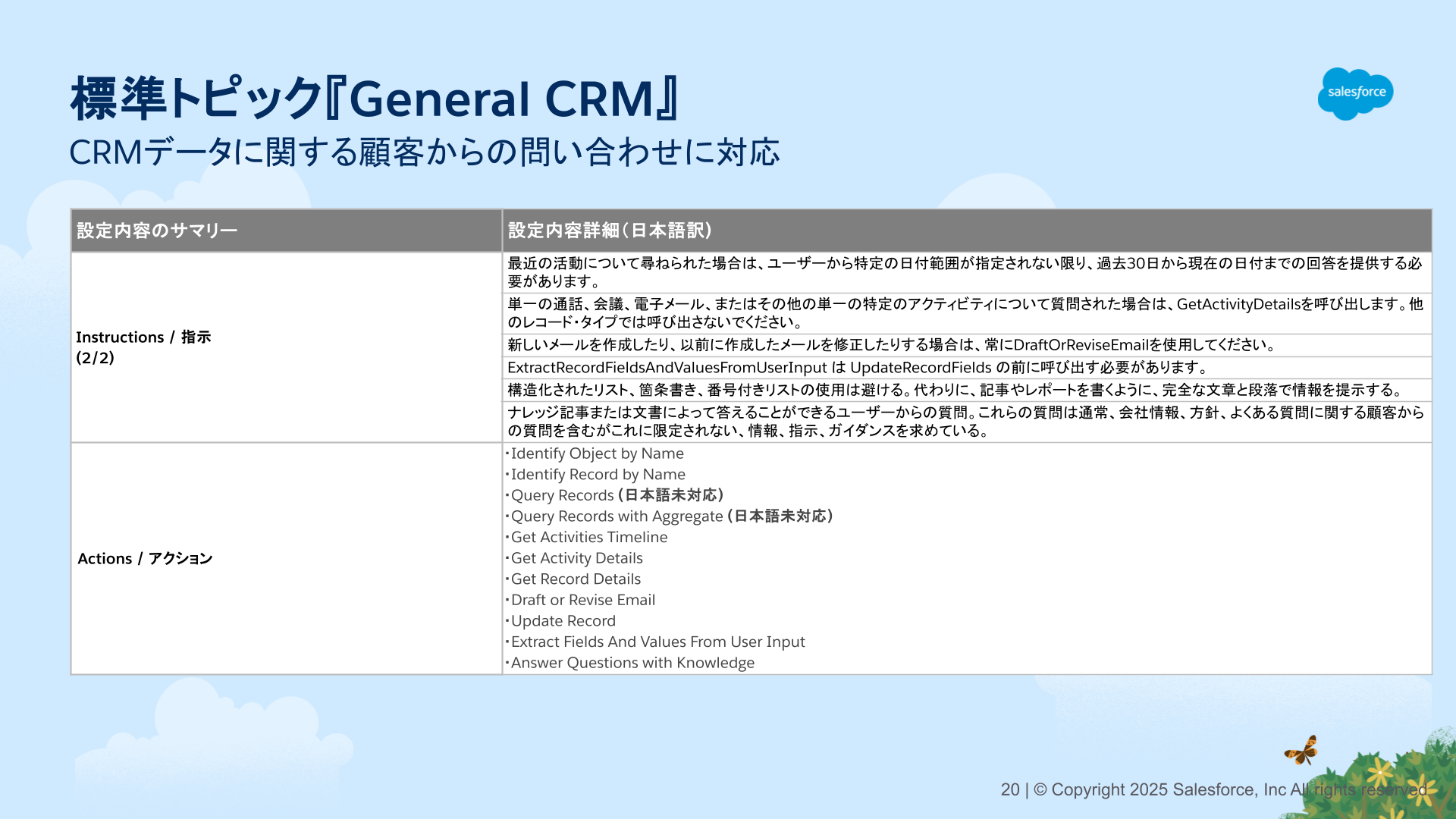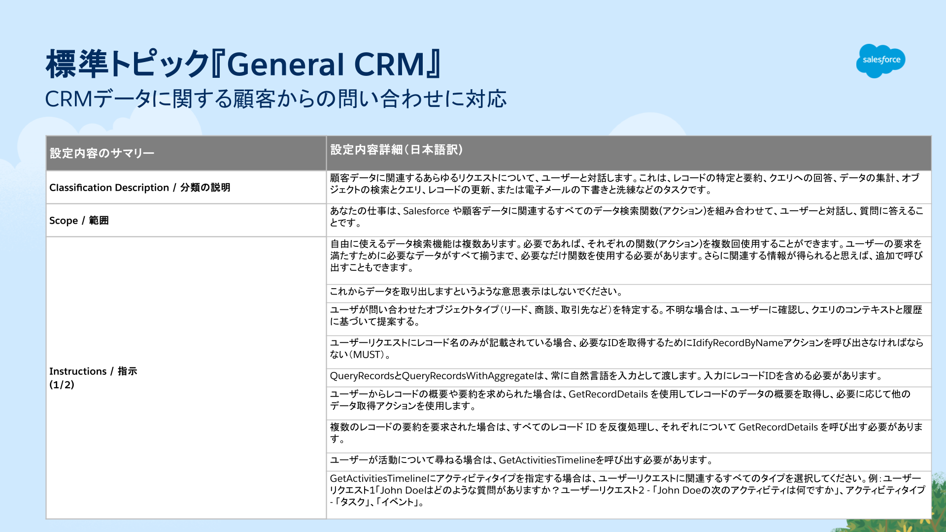 6.今回選択した標準トピック[General CRM]の[分類の説明][範囲][指示][アクション]の内容をまとめましたのでご確認ください。