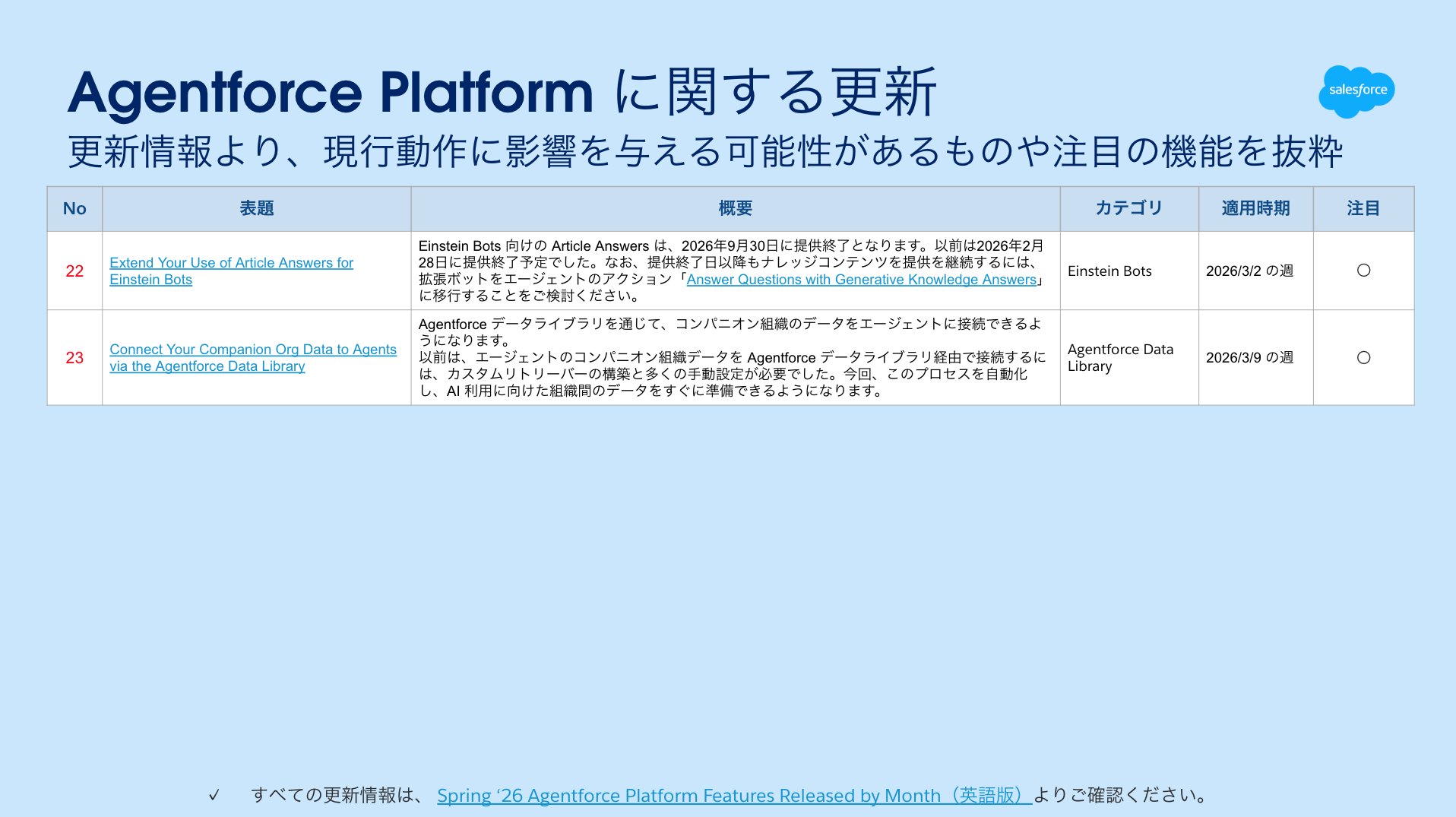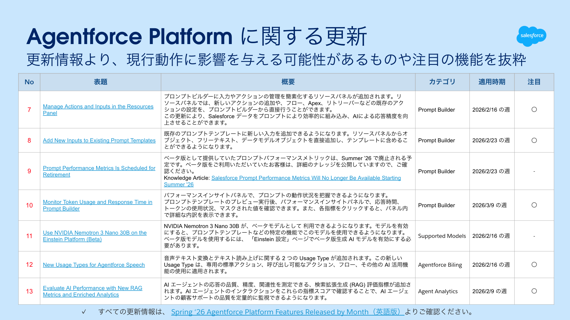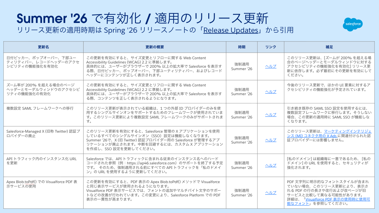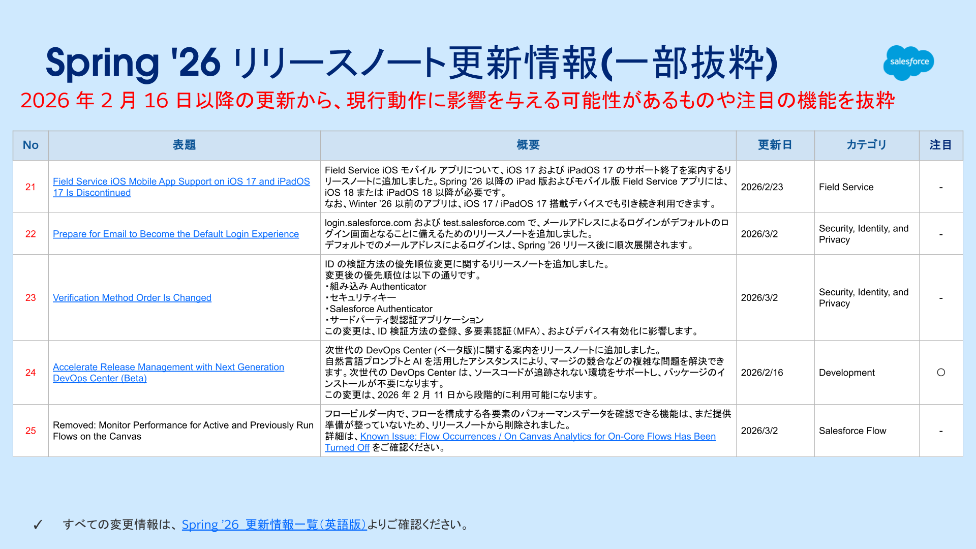 なお、Spring ‘26 リリースノートにおけるすべての更新情報を確認する場合は、リリースノートの更新情報一覧をご参照ください。