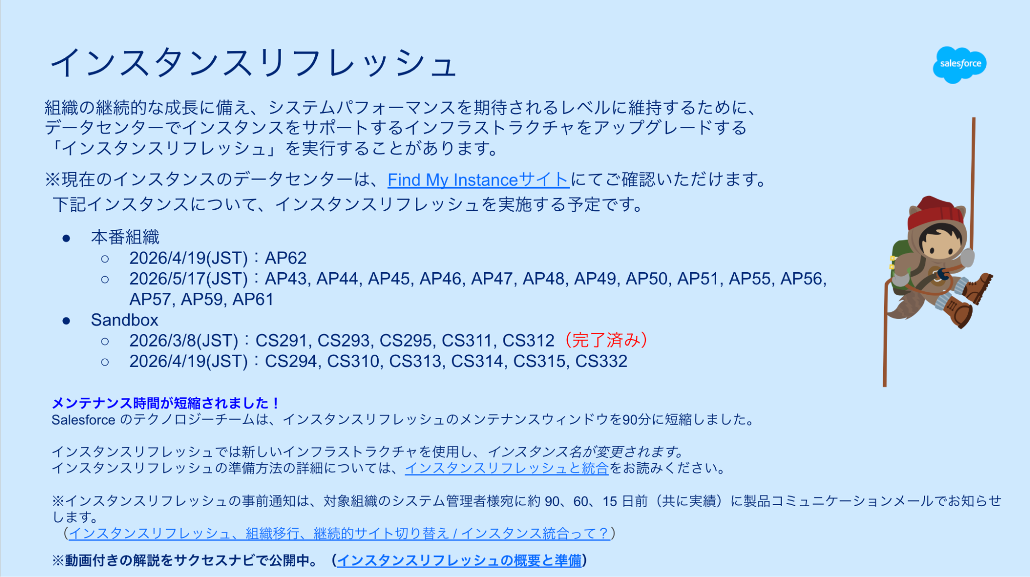 また、来月以降も本記事に記載されている日程で本番組織、Sandbox 組織ともにインスタンスリフレッシュが計画されています。