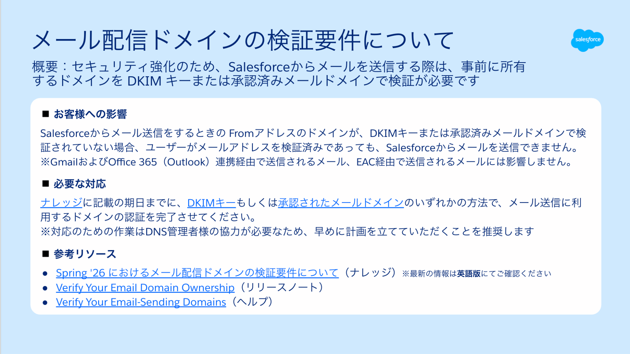 - Spring '26 におけるメール配信ドメインの検証要件について(ナレッジ)