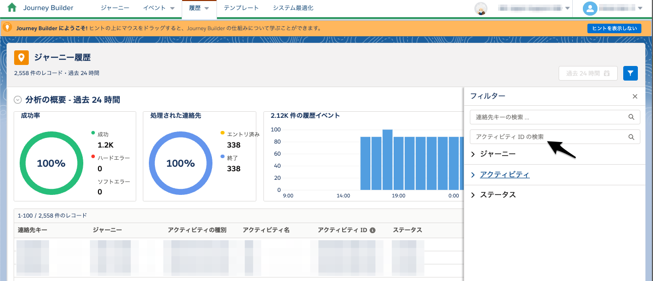 Journey Builderの[履歴]タブのダッシュボードから、より完全な履歴データを取得できるようになりました。従来は画面に表示されている履歴データのみ取得可能でしたが、過去30日以内のフィルター条件に一致するすべての履歴データを取得できるようになりました。また、履歴データをActivityIDで検索することもできるようになりました。