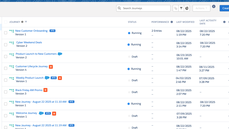 ジャーニーダッシュボードに新しいアイコンが追加され、ハイスループット送信やSalesforceアクティビティなどが設定されたジャーニーをダッシュボード上で識別できるようになりました。また、ジャーニーが最後に連絡先を処理した日時を示す「LAST ACTIVITY DATE」列が追加されました。