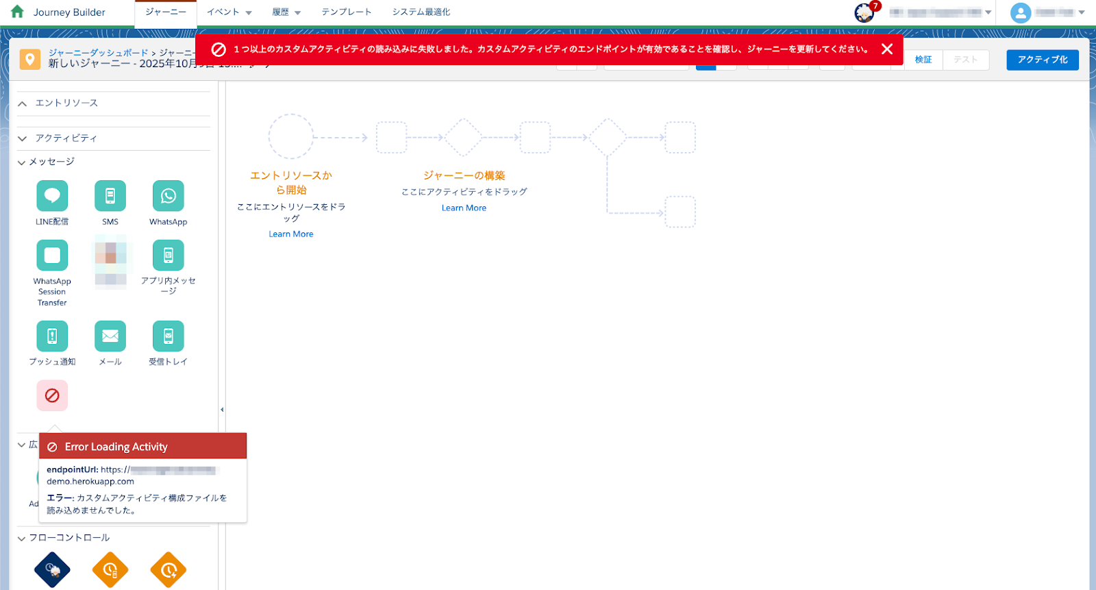 カスタムアクティビティの問題を迅速に検知して修正できるようになりました。ジャーニーキャンバスでカスタムアクティビティの読み込みに失敗した場合、読み込みに失敗した URLのエンドポイントが画面上に表示されるようになりました。