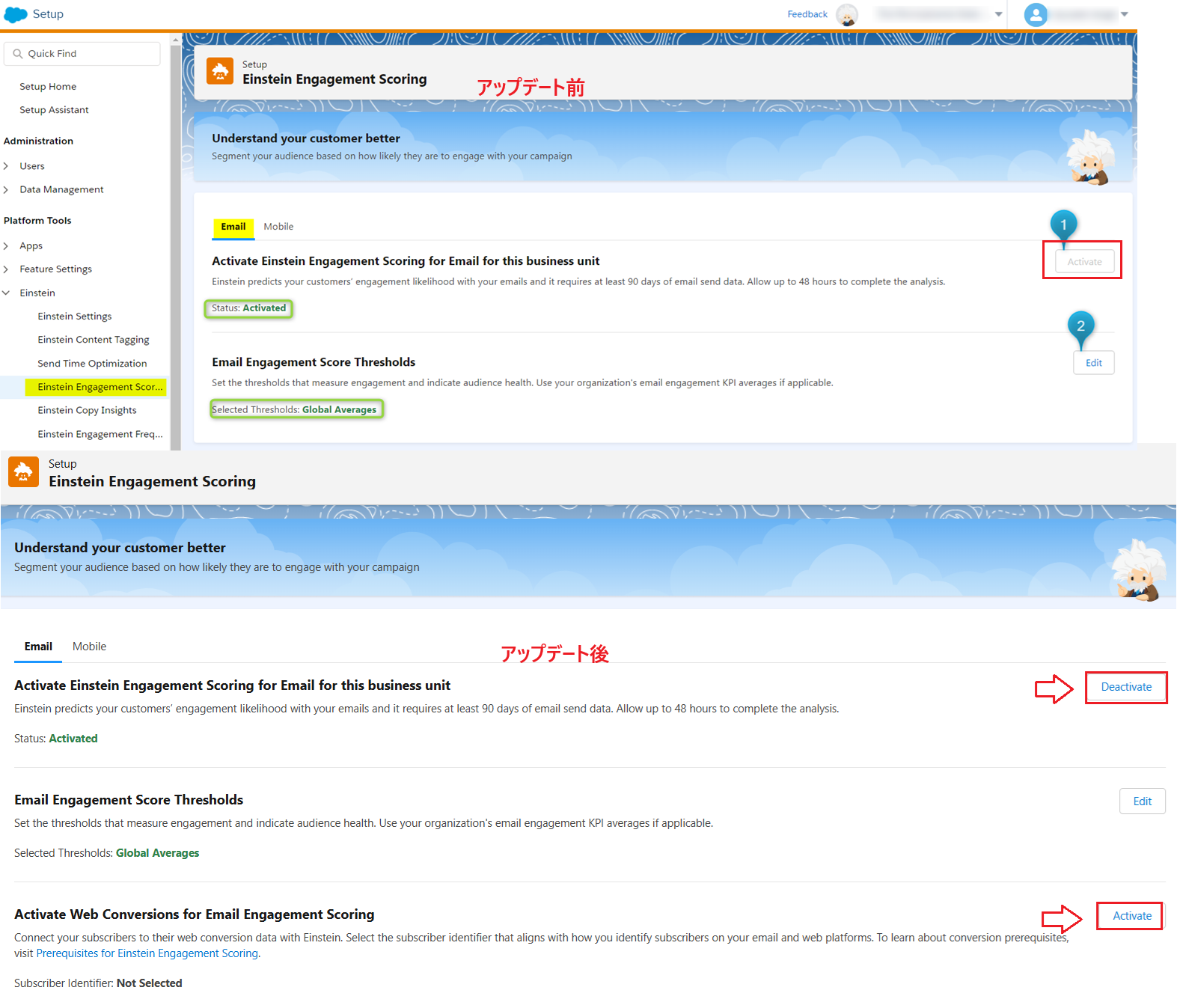 Setup > Einstein Engagement ScoringからEngagement ScoringとWeb Conversion機能の有効化・無効化操作ができるようになりました。