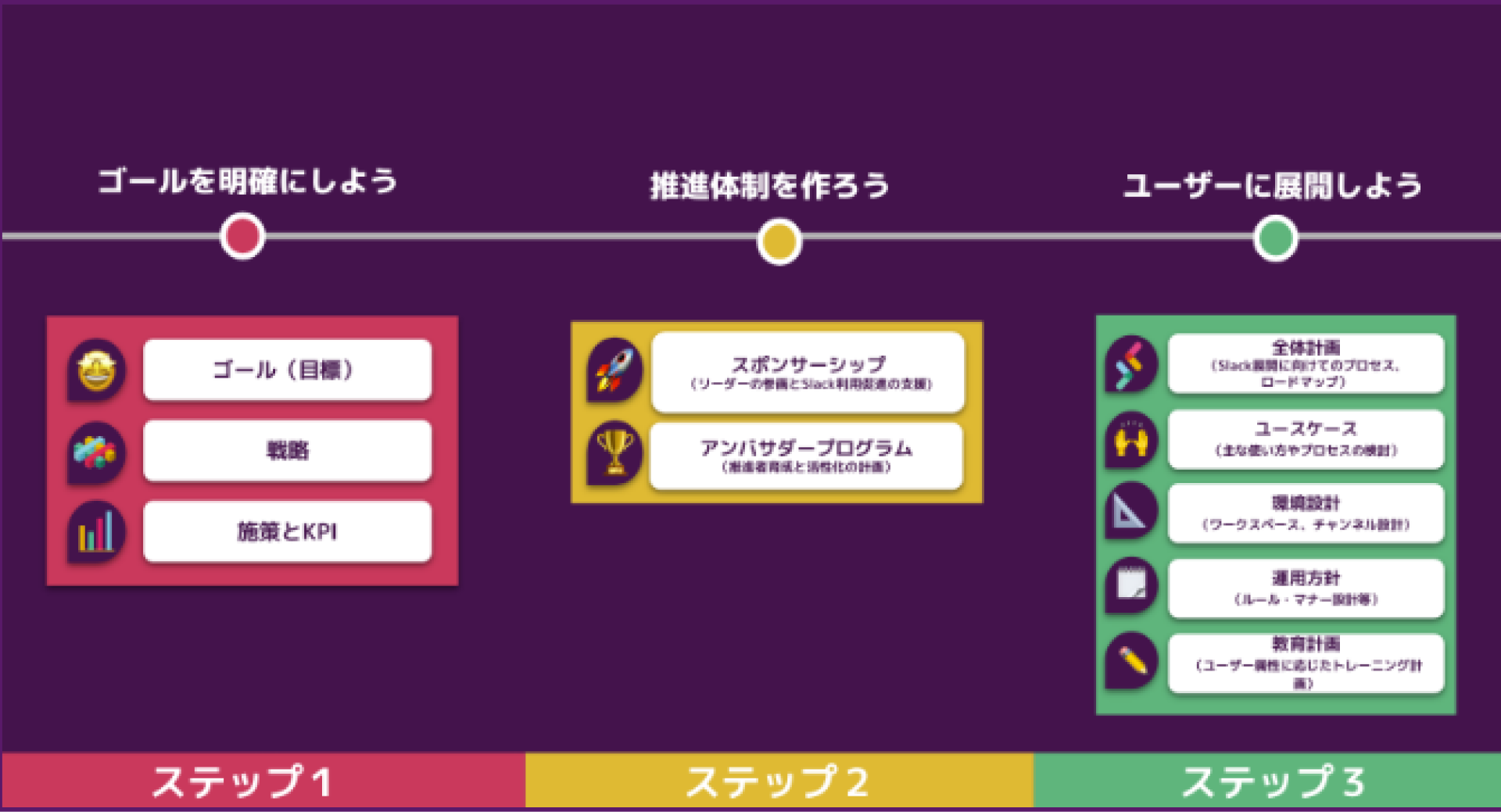 Slack導入・活用の成功に向けて、以下のステップに沿って取り組みましょう